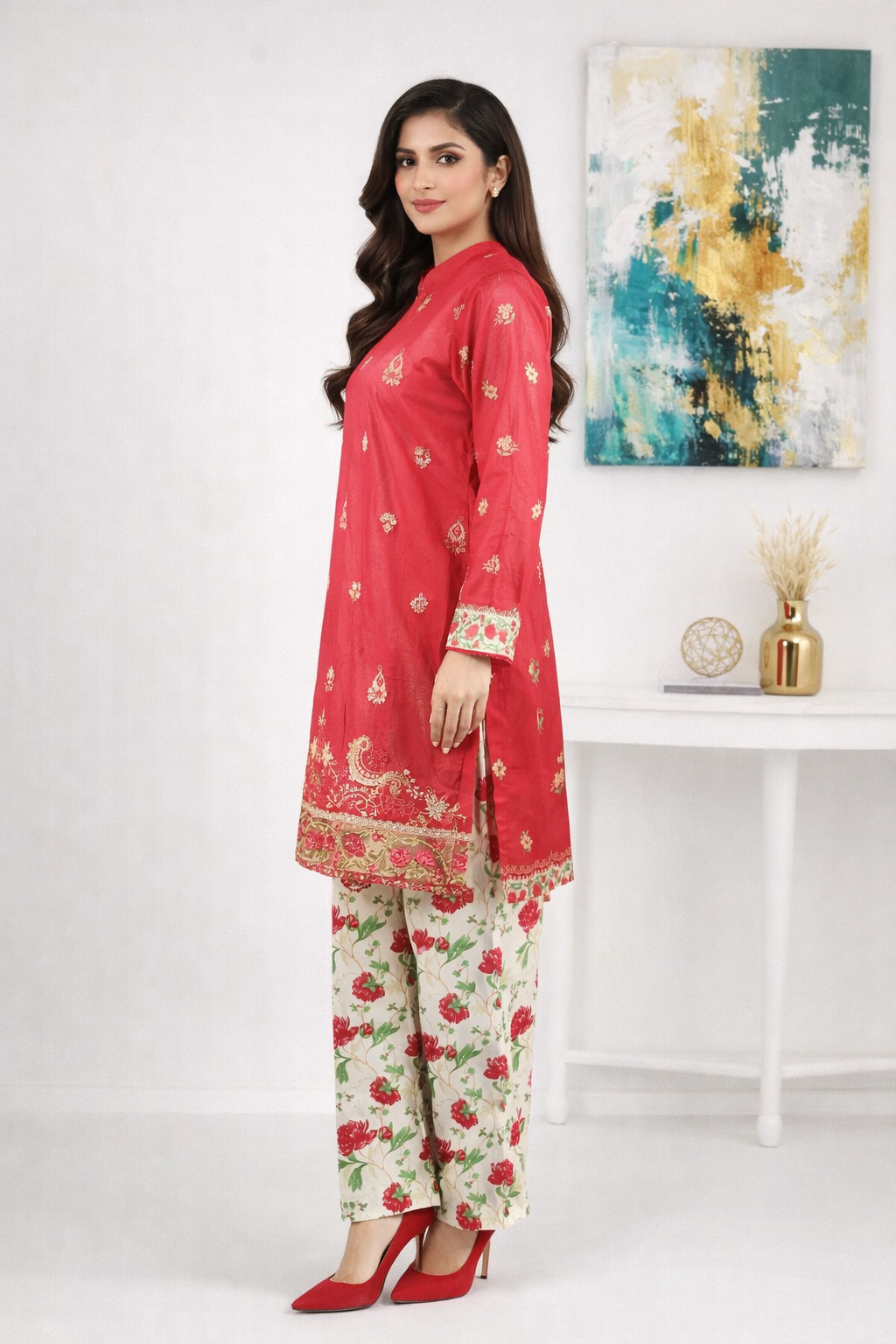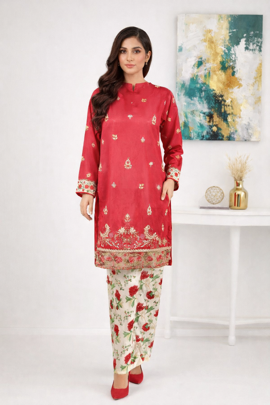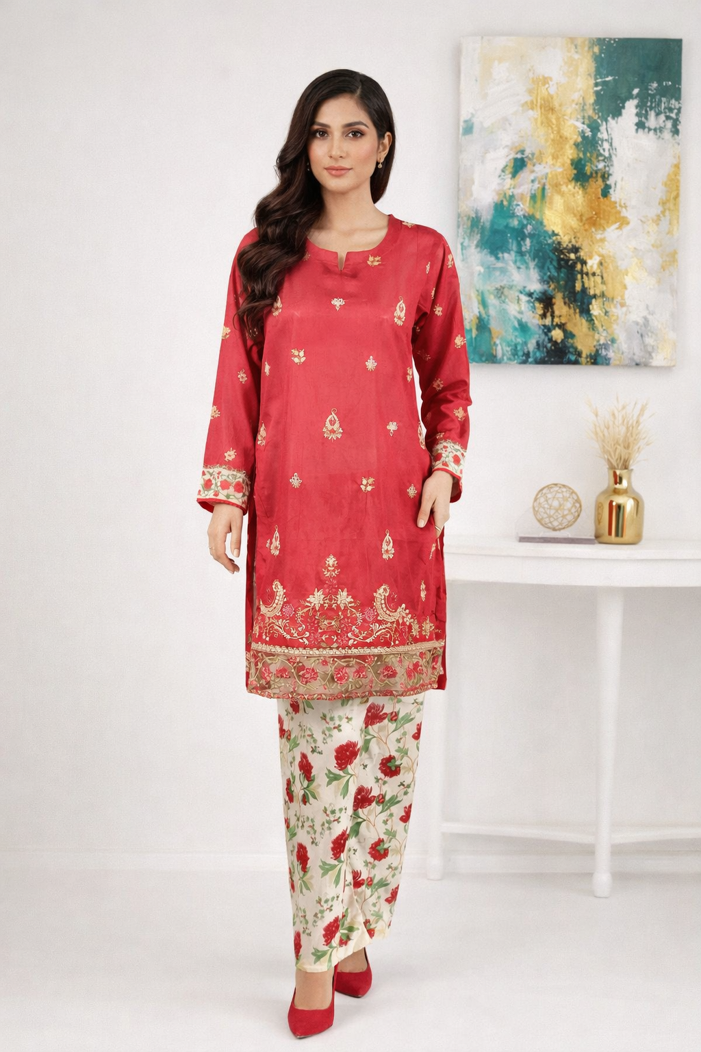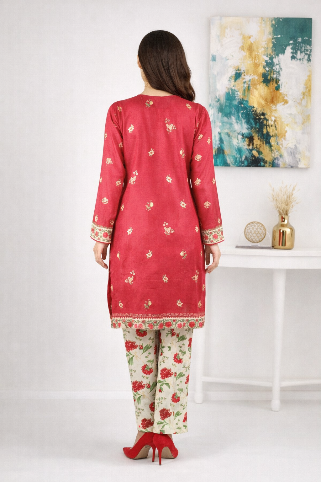 Elevate your everyday style with this beautifully designed two-piece embroidered suit that blends elegance with comfort. The outfit features a vibrant red kurta adorned with delicate golden motifs and intricate embroidery on the hem and sleeves, adding a refined traditional touch. The kurta is paired with off-white floral printed trousers, creating a graceful contrast that enhances the overall look.